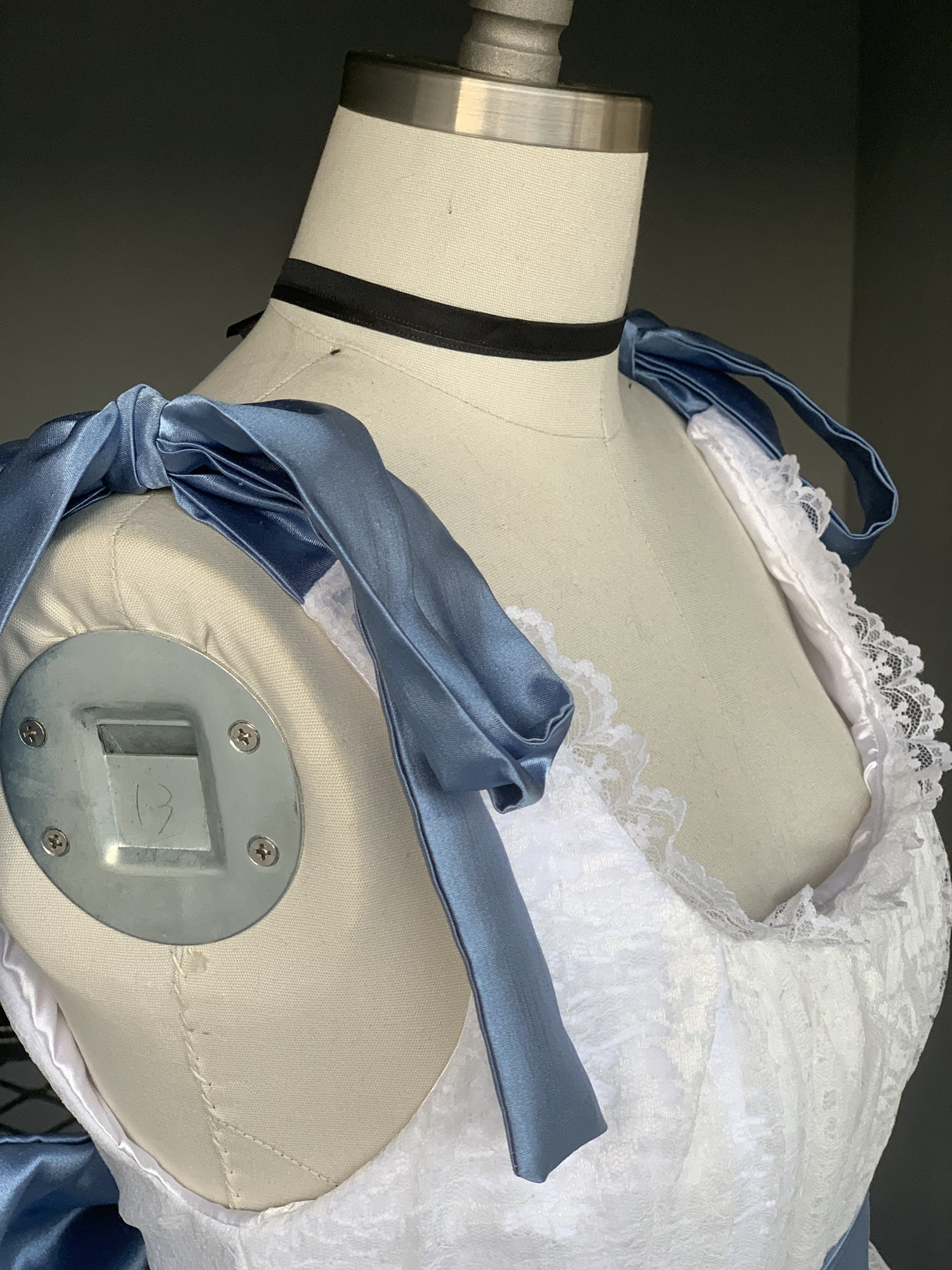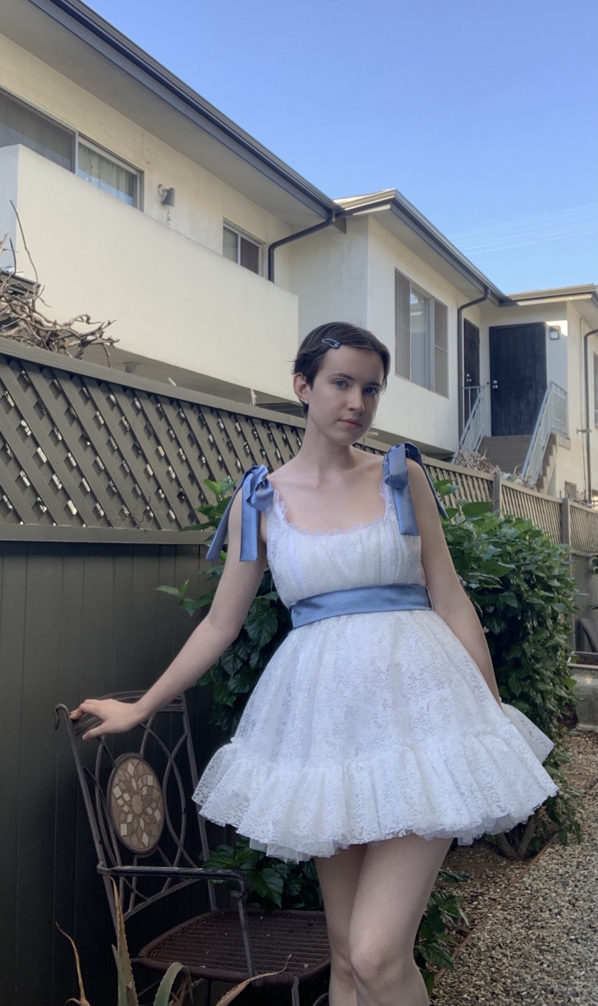 The Marie Dress is a gorgeous, handmade in LA tea dress custom made to your measurements. The shoulder ties and back bow can create a custom fit to you, and adjust whenever needed. Her original colors are white and powered blue, but the colors can be interchanged to your preference. The dress shown in the photos has a petticoat under to create more fluffiness.